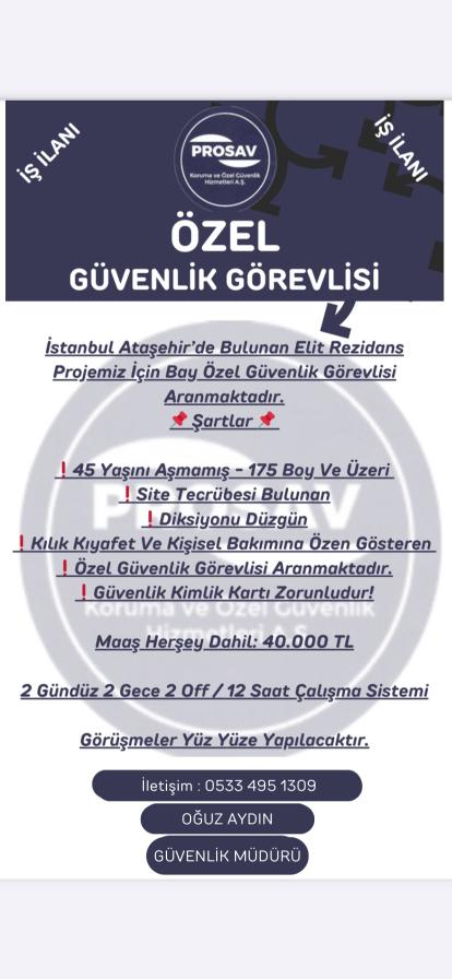 Ataşehirde bulunan elit Residance projemize bay özel güvenlik görevlisi aranmaktadır 35.000 maaş 5000 ticket vergi kesintisi yok 2+2+2 sisteminde çalışma sistemi
