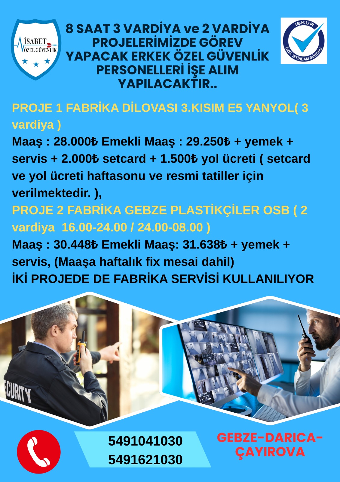 8 SAAT VARDİYA VE 2 VARDİYA PROJELERİMİZDE GÖREV YAPACAK ERKEK ÖZEL GÜVENLİK PERSONELLERİ İŞE ALIM YAPILACAKTIR