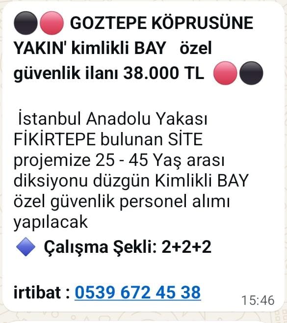 GÖZTEPE KÖPRÜSÜNE YAKIN KİMLİKLİ BAY ÖZEL GÜVENLİK İLANI 38.000TL