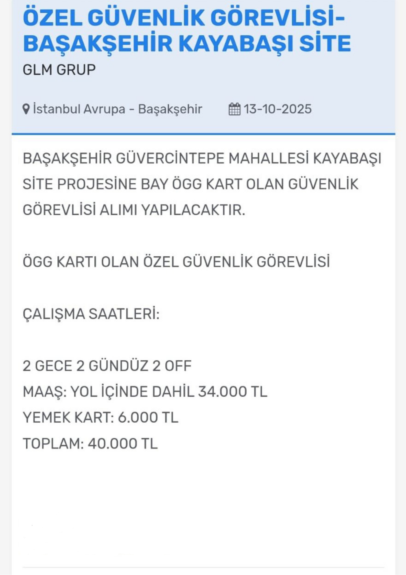 BAŞAKŞEHİR GÜVERCİNTPEP MAHALLESİ KAYABAŞI SİTE PROJESİNE BAY ÖGG KARTI OLAN GÜVENLİK GÖREVLİSİ ALIMI YAPILACAKTIR