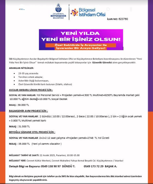 İBB Küçükçekmece-Avcılar-Başakşehir Bölgesel İstihdam Ofisi ve Küçükçekmece Belediyesi koordinasyonu ile düzenlenen “Yeni Yılda Yeni Bir İşiniz Olsun” temalı mülakat kapsamında çeşitli lokasyonlar için Güvenlik Görevlisi alımı gerçekleştirilecektir.