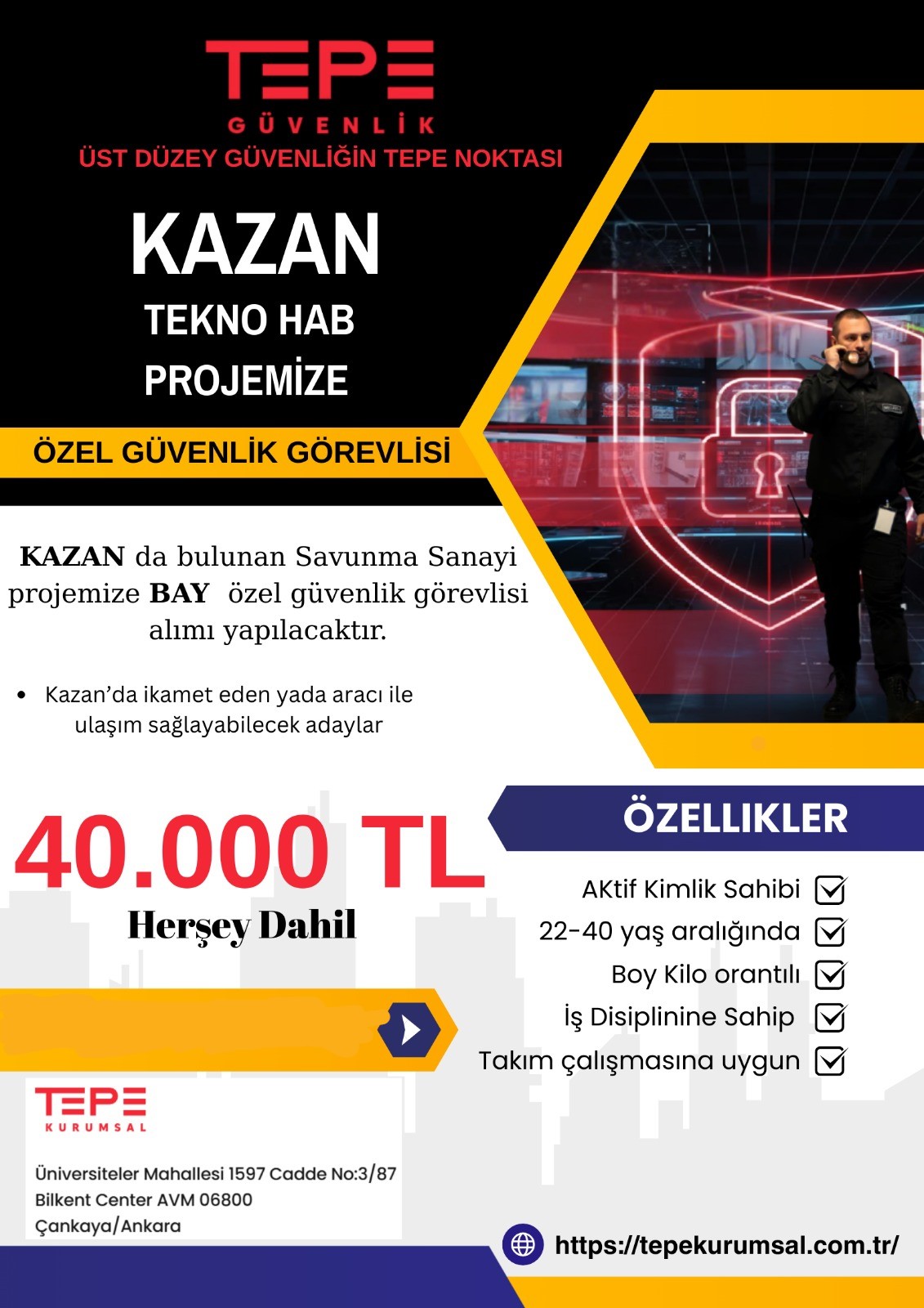 KAZAN TEKNO HAB PROJEMİZE ERKEK GÜVENLİK ALINACAKTIR.