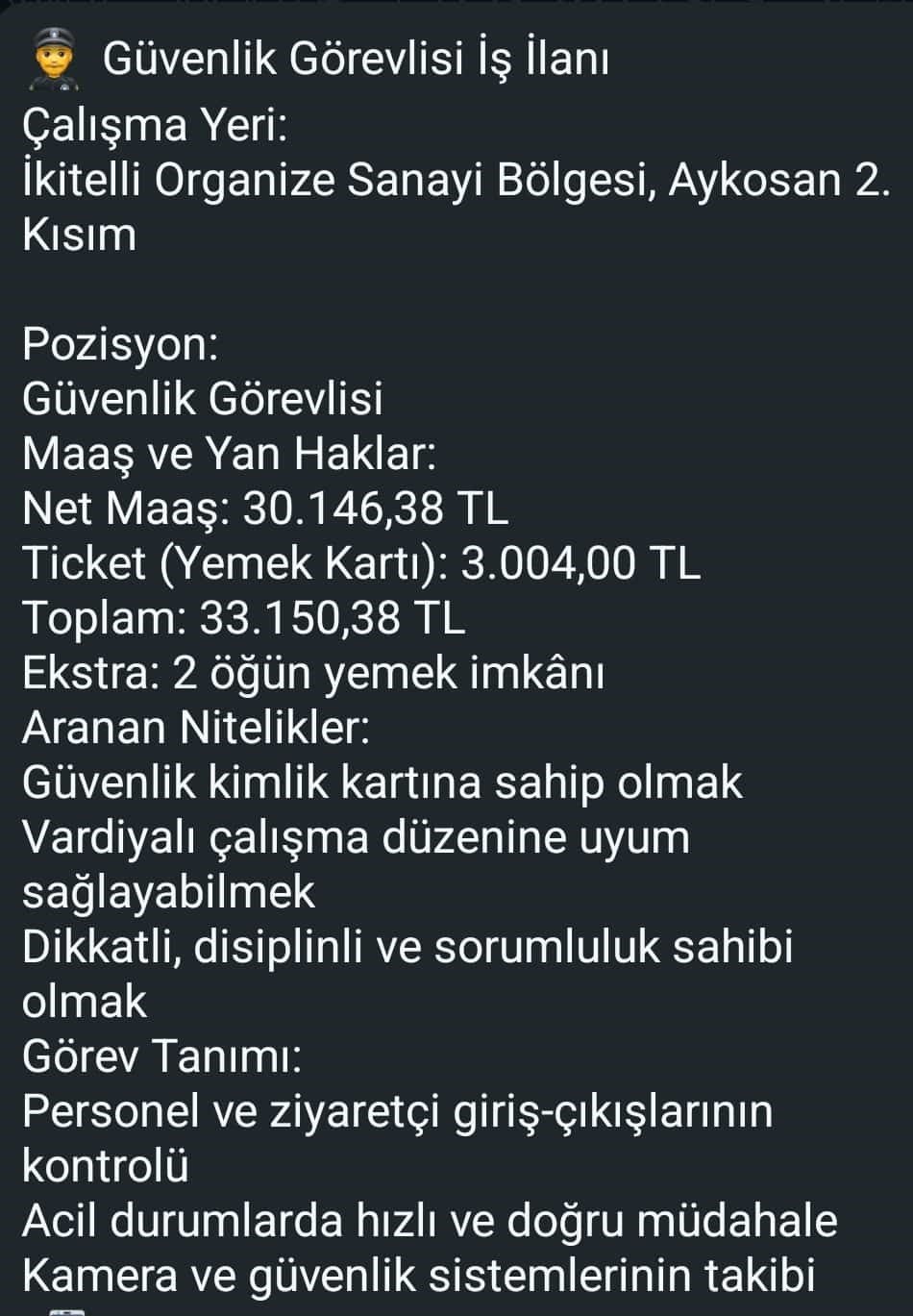 İKİTELİ ORGANİZE SANAYİ BÖLGESİ AYKOSAN 2.KISIM İÇİN GÜVENLİK GÖREVLİSİ ARANIYOR