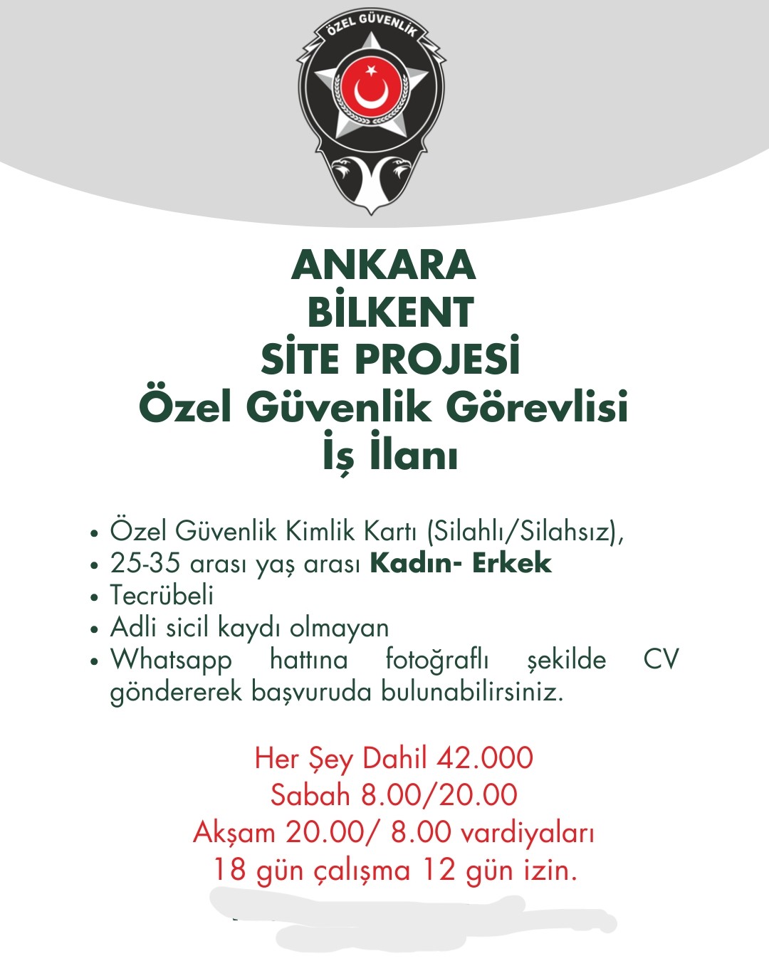 ANKARA BİLKEND SİTE PROJESİ BAY BAYAN GÜVENLİK ARANIYOR