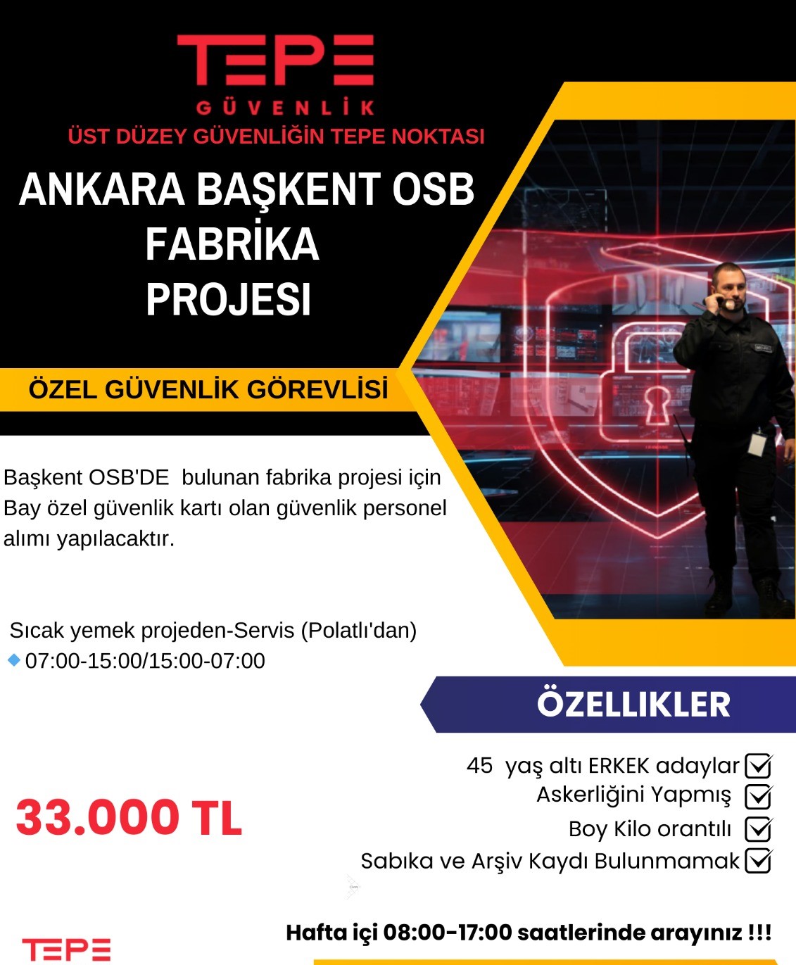 BAŞKENT OSB'DE BULUNAN FABRİKA PROJESİ İÇİN BAY ÖZEL GÜVENLİK KARTI OLAN GÜVENLİK PERSONELİ ALINACAKTIR