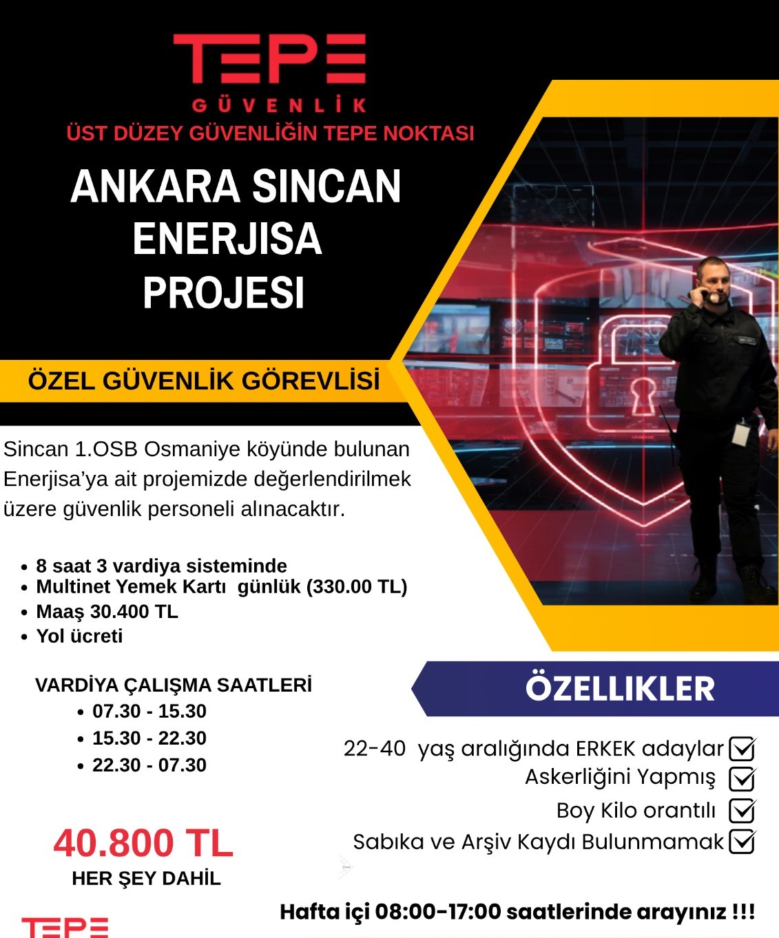 ANKARA SİNCAN ENERJİSA PROJESİ İÇİN ERKEK GÜVENLİK ARANIYOR