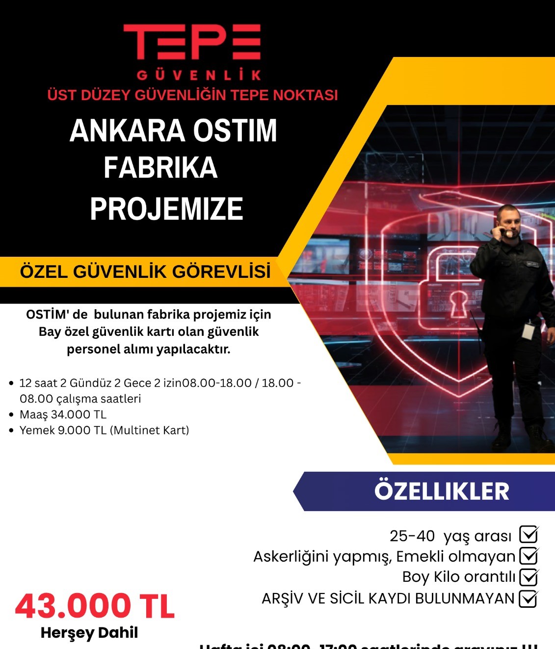 ANKARA OSTİM FABRİKA PROJEMİZE ERKEK GÜVENLİK ARANIYOR